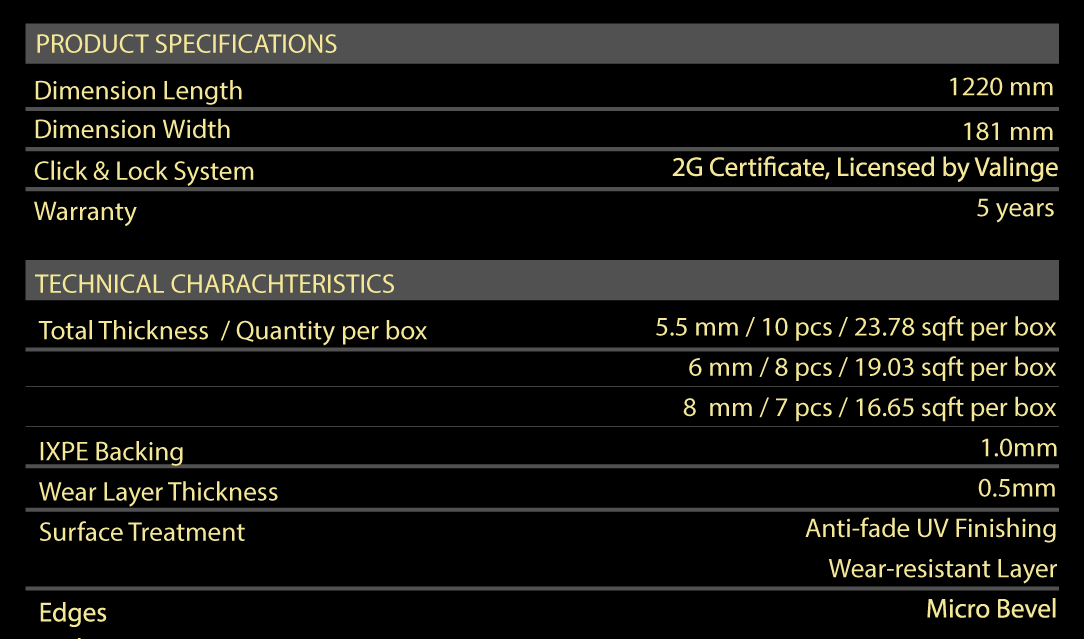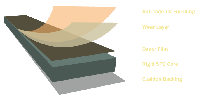 The main contents of SPC Tiles Flooring Core are polyvinyl 1 chloride, natural limestone powder and stabilizers. SPC Tiles flooring combines the strength of stone and the beauty of wood with four layers designed to resist wear and retain a luxurious look for decades.